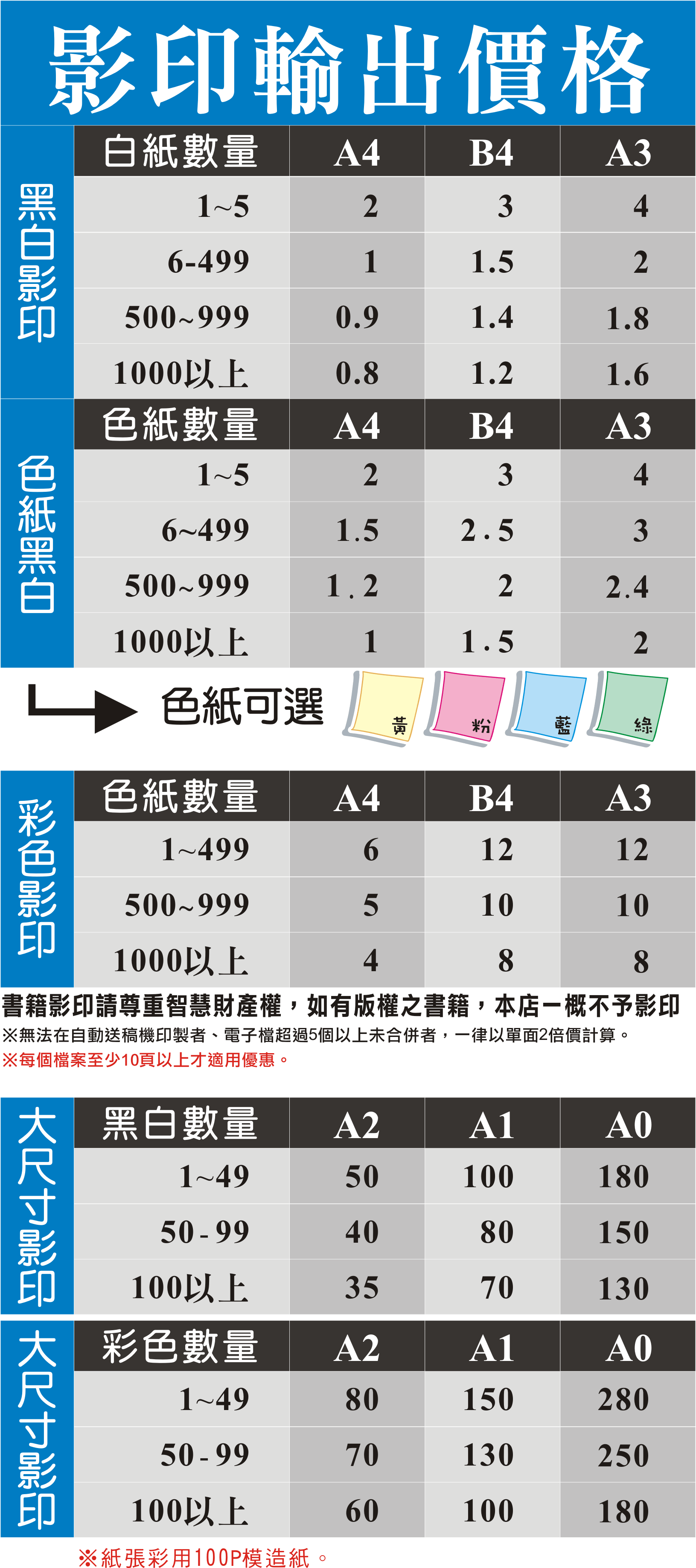 十三.詢問價格請告知是單面或雙面,彩色或黑白,尺寸大小,一張紙本就有二面,雙面是單面2倍價,A4以下紙張都同價,B4是A4的1.5倍價,A3是A4的2倍價。