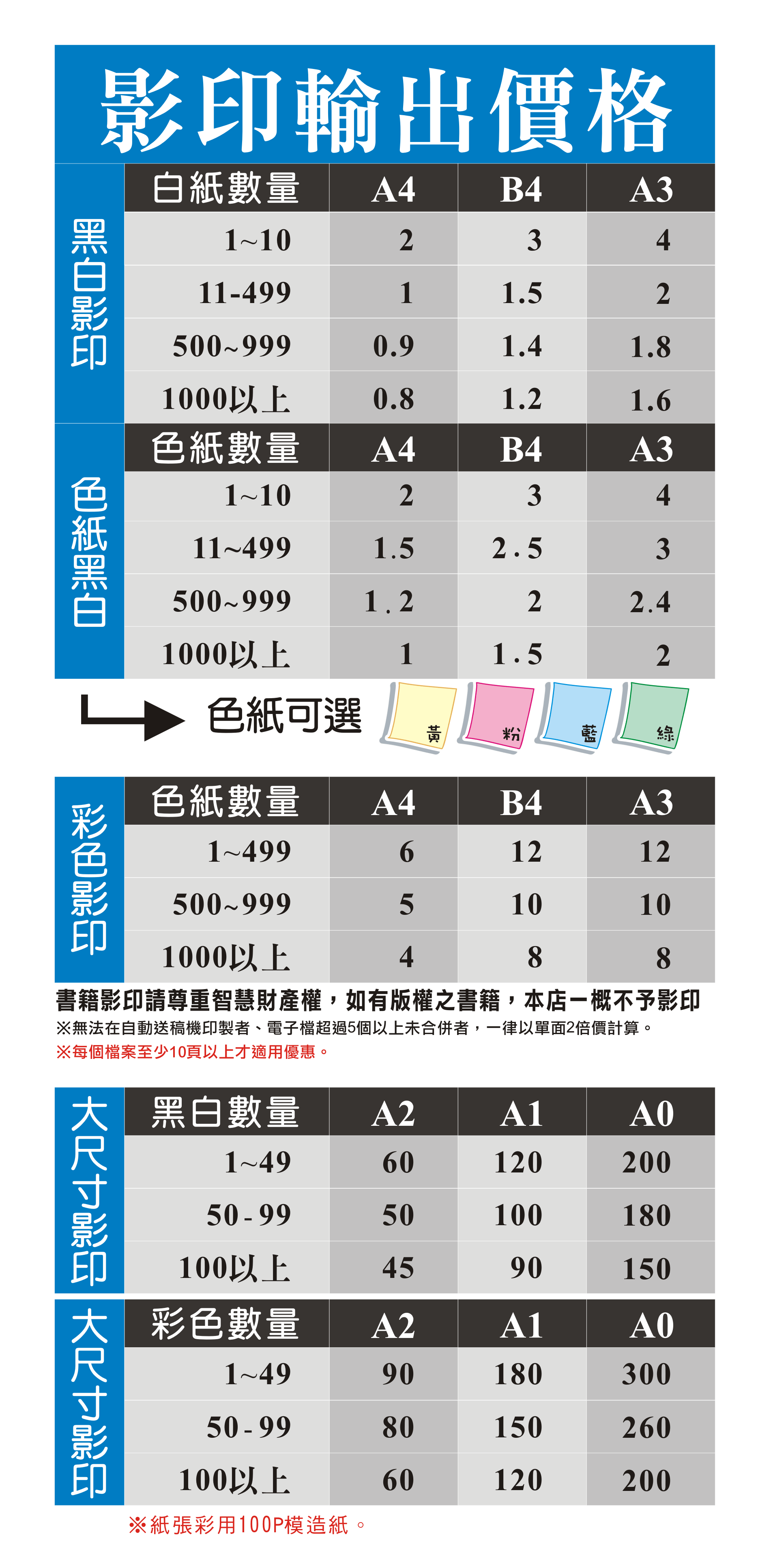 一.影印前請客戶自行拔除訂書釘,本店無免費拔釘(費用2-20元,視難易程度),無法自動送稿者一律單頁2元,雙面4元。